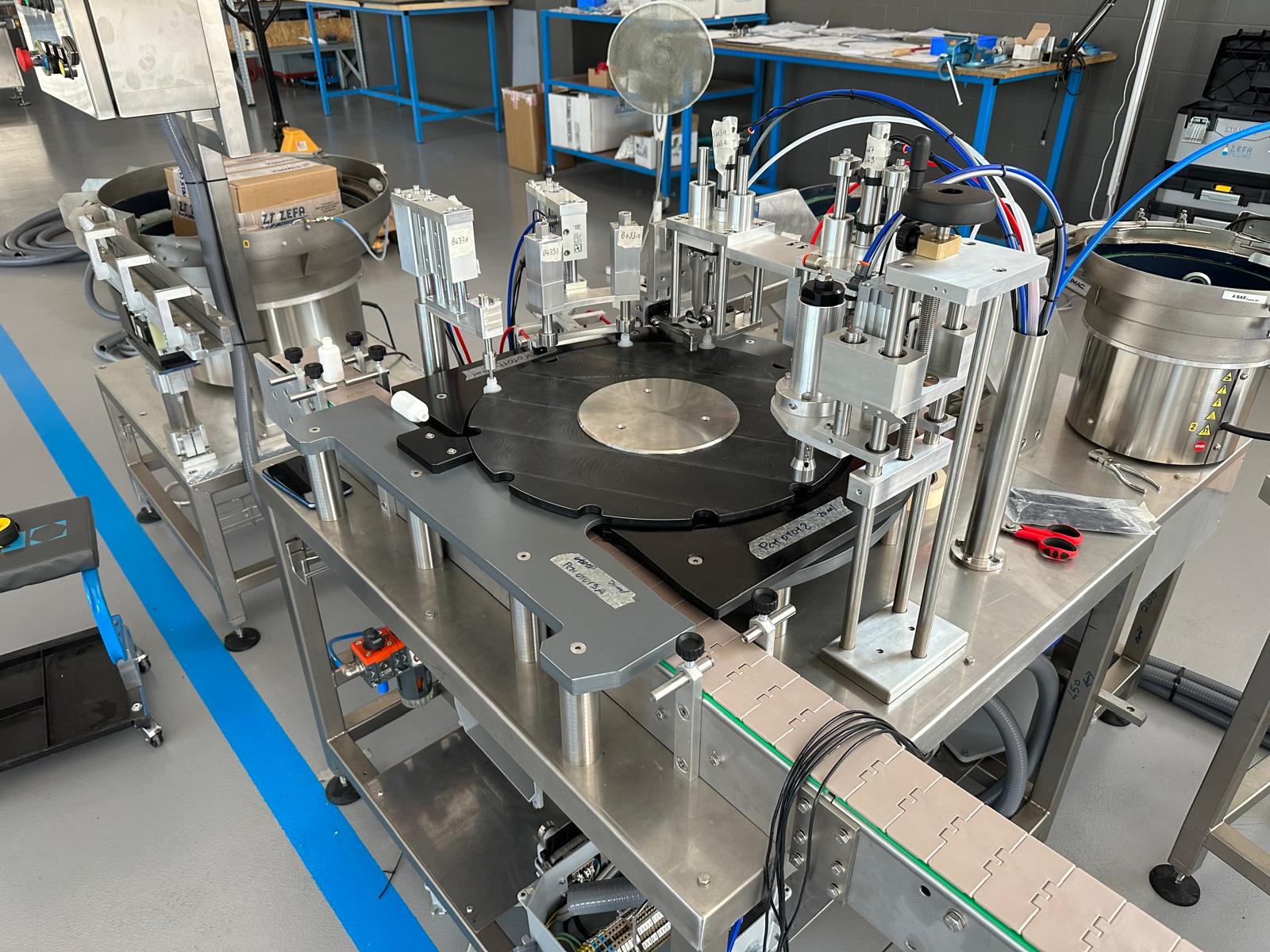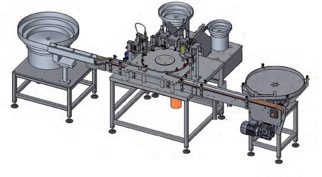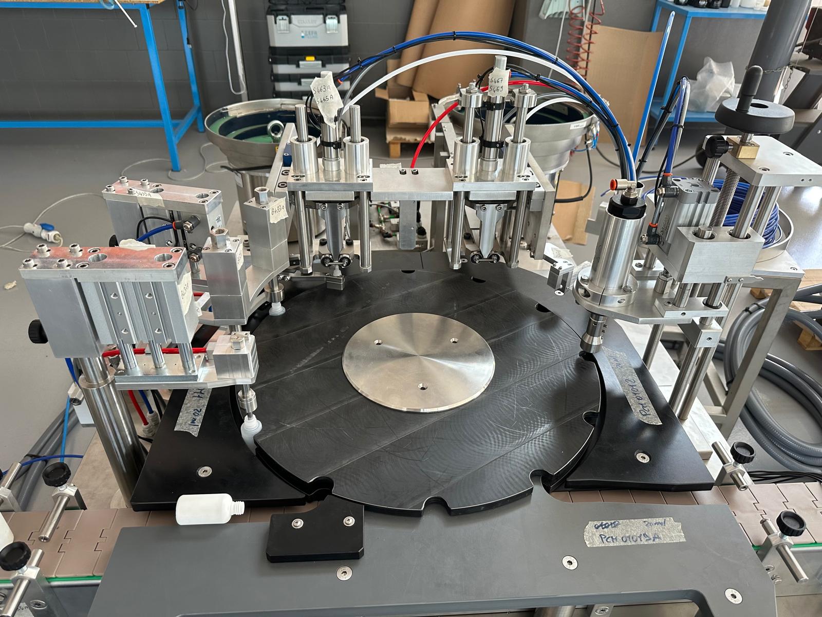 √ Inserimento automatico di sottotappo e tappo, mediante tazze e canali vibranti con avvitatura automatica dotata di controllo di coppia.